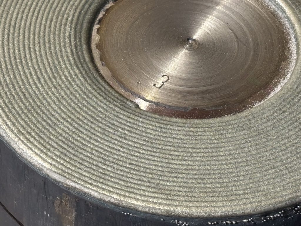 - Der Plattenkeil wird zunächst nur so weit auf Untermaß abgedreht, dass eine plane, gleichmäßige Oberfläche entsteht – ein kompletter Abtrag der alten Aufpanzerung ist nicht nötig.